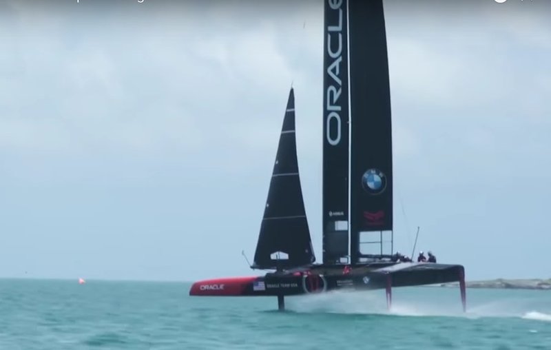 At about 40 seconds into the video they start a gybe but the boat starts to heel too much. They make a quick recovery and the boat splashes down off its foils.