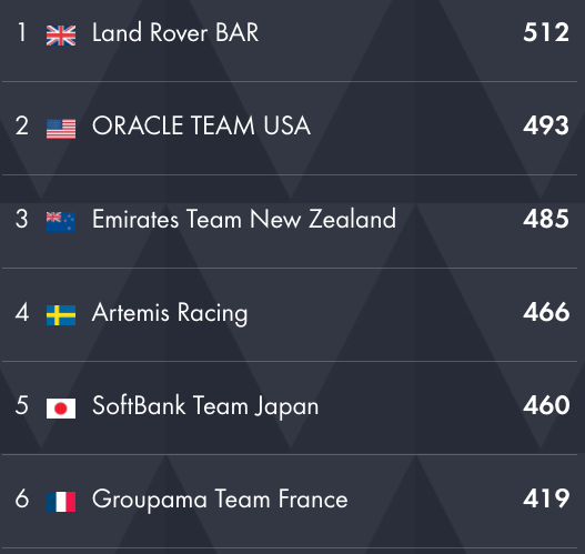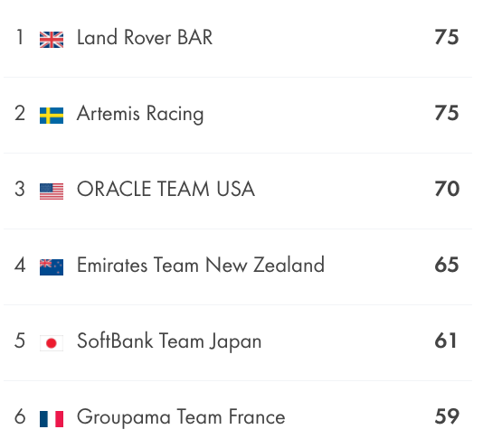 Remember that these standings will be used as the tie-breaker at the end of the AC Qualifiers - they could determine which challenger is eliminated and who gets a one point lead in the America's Cup Match.