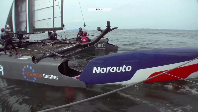 Oracle received a penalty for not keeping clear of BAR, to leeward. Oracle rounded the first mark in last place but managed to finish ahead of New Zealand and hold on to the bonus point. Click the photo to watch the video. You'll see the action and hear the post race interviews. Image: ACTV.