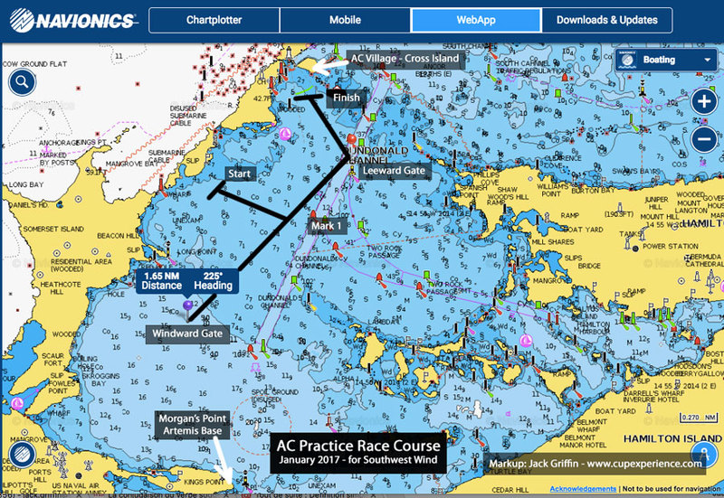 This is my best guess about the race course being used when the prevailing southwest wind blows. The windward-leeward legs will probably be longer for the "real" racing in May and June. You can play with the chart, zooming and panning, with the Navionics web app here.