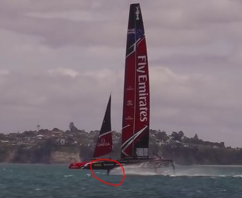Graeme Spence went over the front crossbeam when Oracle Team USA’s America’s Cup Class yacht dropped off the foils in training on Wednesday 22 February 2017. Graeme was lucky not to be hit by the daggerboard or rudder. Remember that Franck Cammas of Groupama Team France almost lost his right foot when he was hit by the rudder after going overboard in training in France in November 2015. Read about Franck’s ordeal here, here and here.