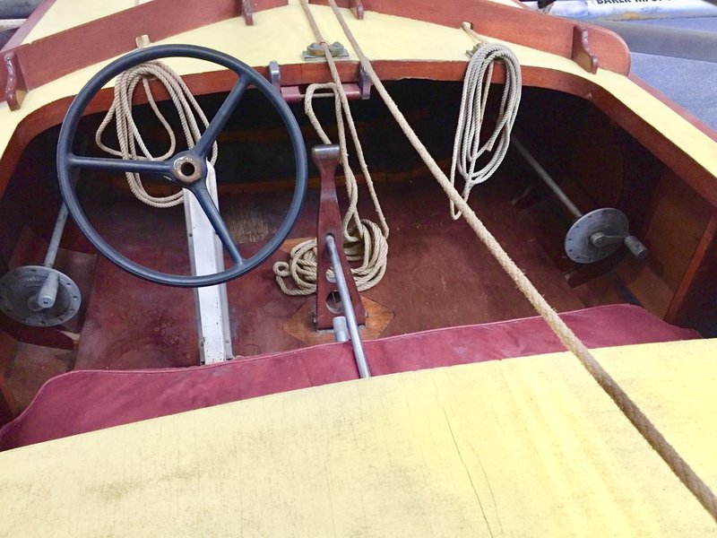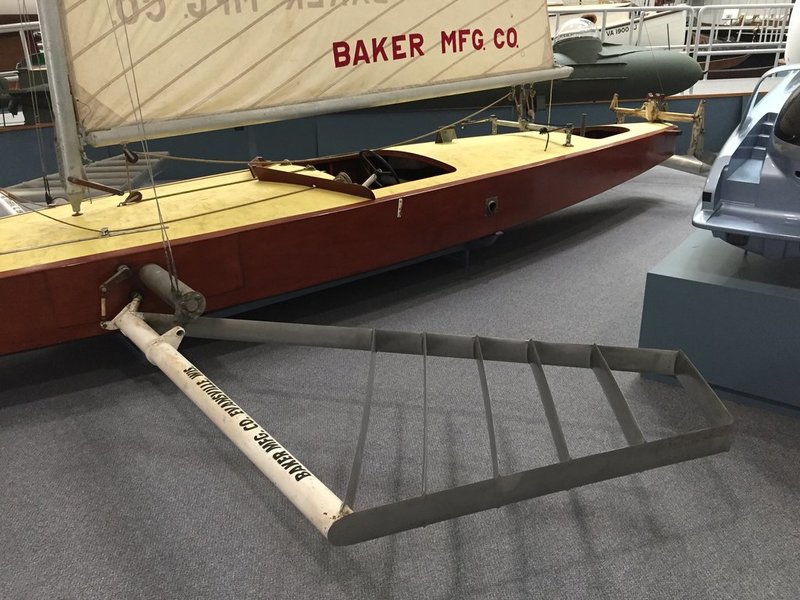 Hand cranks on port and starboard to set angle of incidence. The wooden lever and metal rod controlled the vang assembly seen in the next photo.