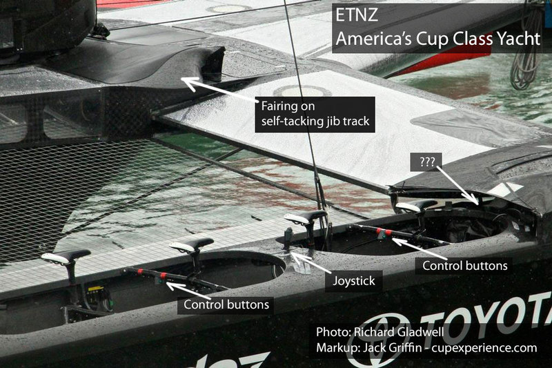 The bicycle grinding stations on Emirates Team New Zealand's America's Cup Class race yacht have more advantages than efficient power generation - they free up the crew's hands to operate controls. In the number 3 position, Blair Tuke has a joystick mounted on the deck. Notice also the attention to aerodynamics, like the fairing around the self-tacking jib track.