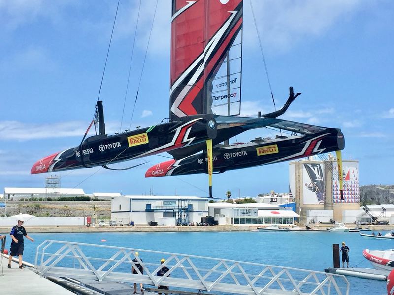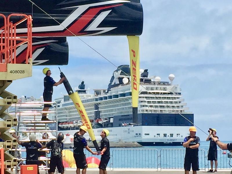 Team New Zealand getting ready to practice on Thursday 15 June. Installing the rudders.